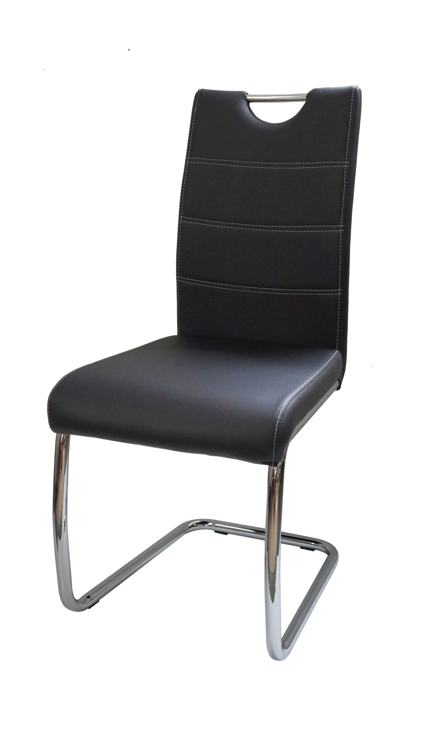 De Elite sledestoel heeft een zwarte, kunstlederen bekleding en is uitgerust met een handgreep. De rugleuning van deze moderne stoel is versierd met horizontale stiksels.