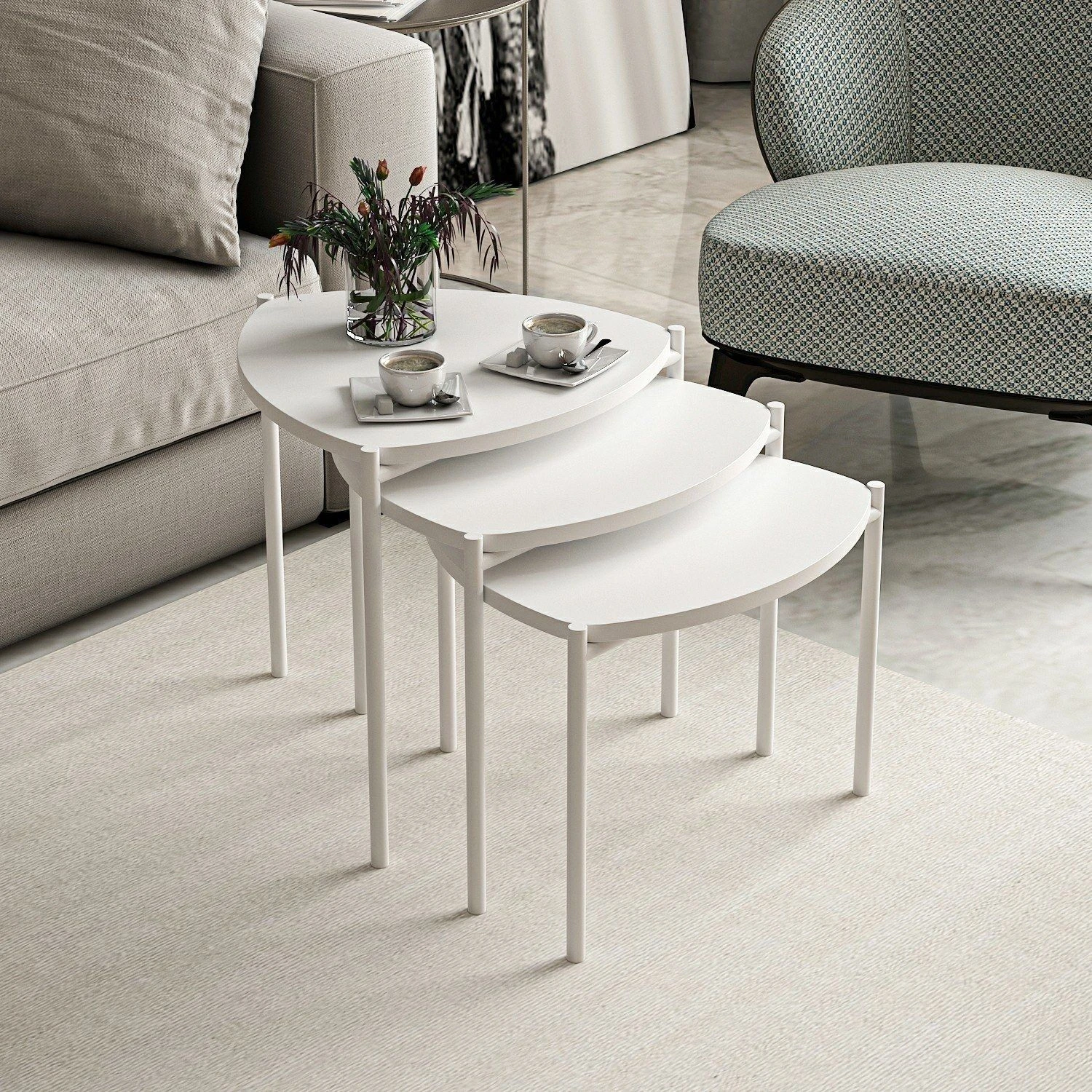 Met een gestroomlijnd metalen frame hebben deze nesttafels een modern en eigentijds ontwerp dat bij elke inrichting past. De witte kleur voegt een vleugje elegantie en verfijning toe aan je ruimte.