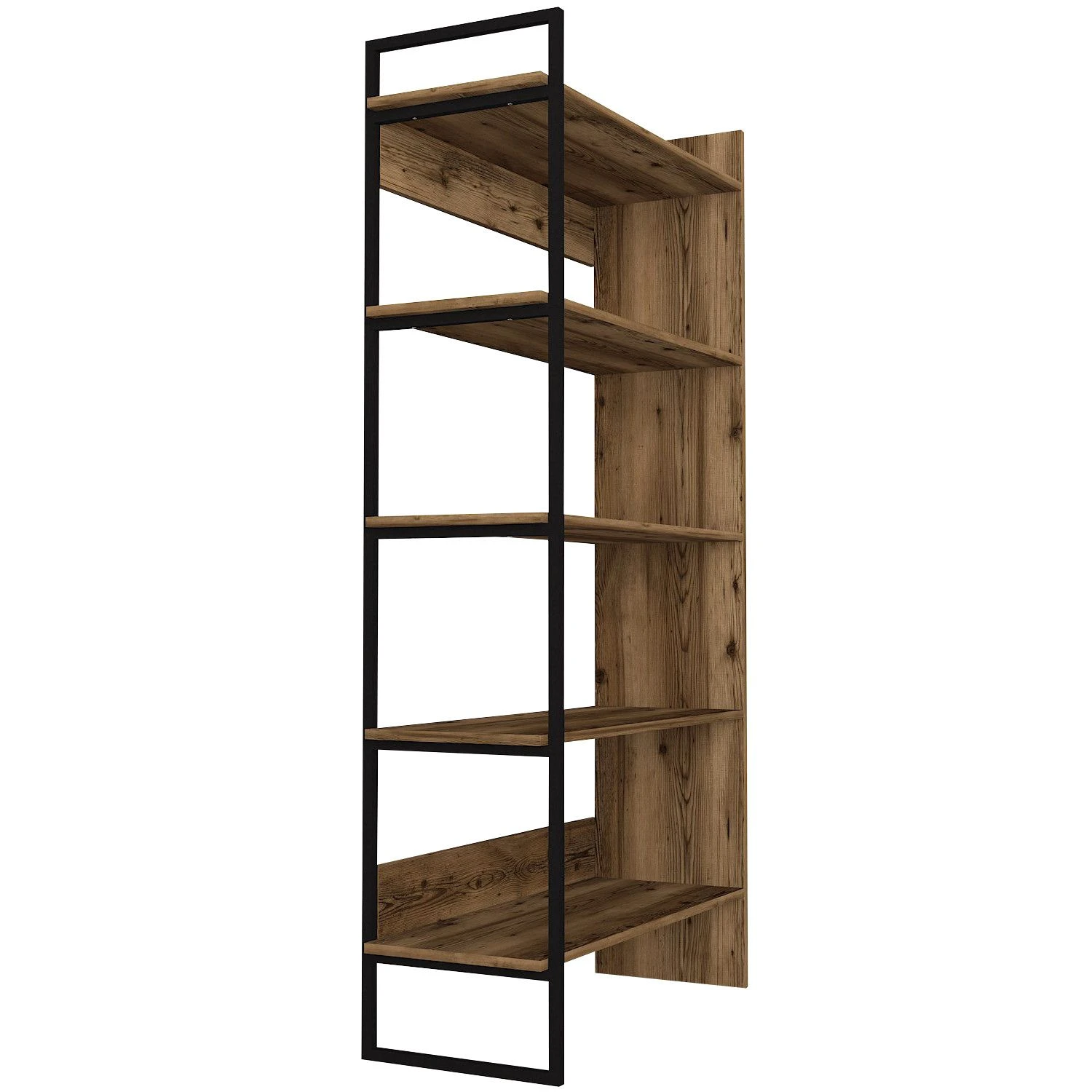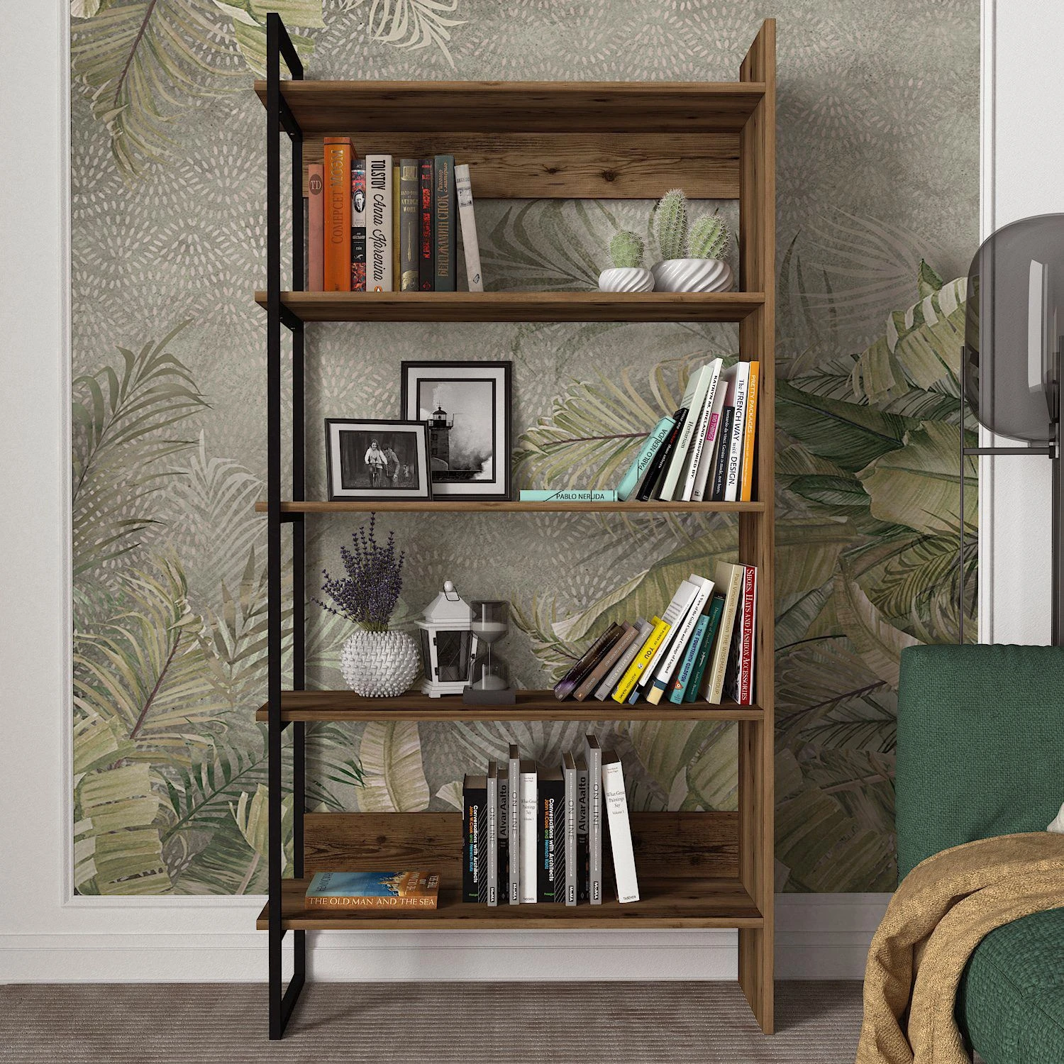 Bovendien voegt het metalen frame van de boekenplank een vleugje industrieel chic toe aan het algehele ontwerp. Het metalen frame versterkt niet alleen de esthetische aantrekkingskracht van het meubel, maar biedt ook extra ondersteuning en versteviging, waardoor de structurele integriteit van de boekenplank gegarandeerd is.