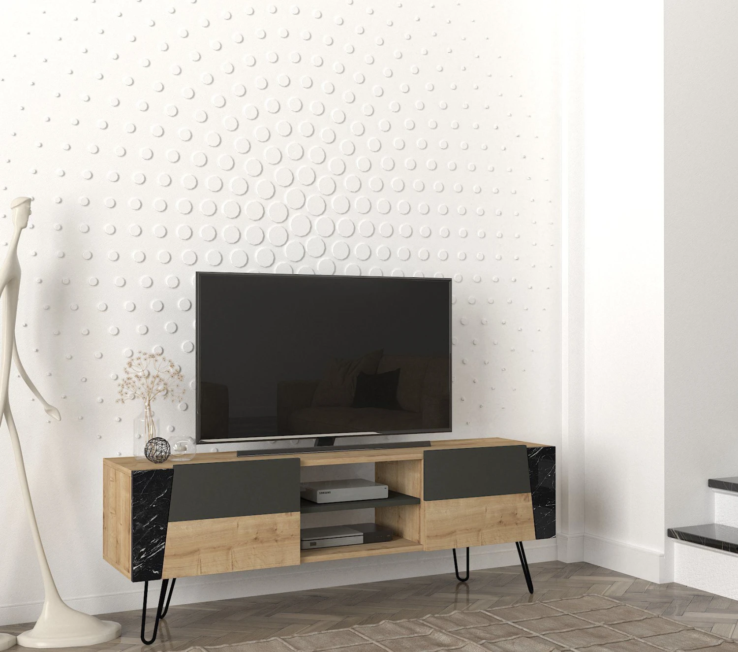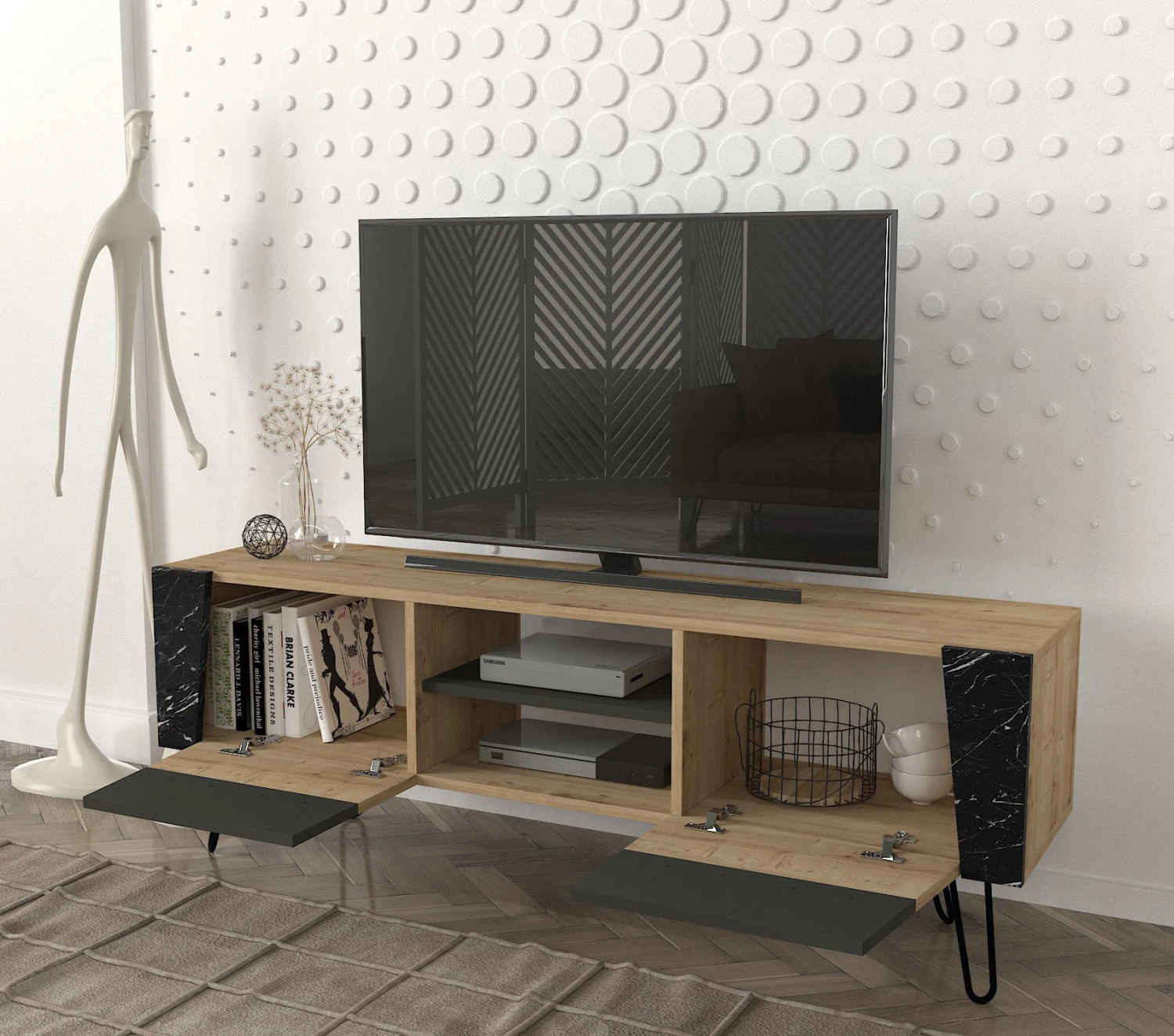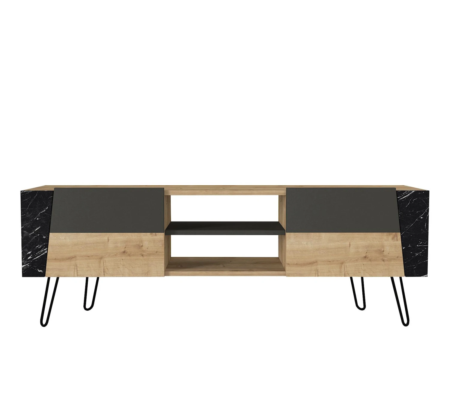Een van de opvallende kenmerken van het Tera Home TV-meubel zijn de metalen poten, die niet alleen een modern tintje aan het ontwerp geven, maar ook uitstekende stabiliteit en ondersteuning. Je kunt erop vertrouwen dat je tv en andere media-apparaten veilig op hun plaats worden gehouden op deze betrouwbare standaard.