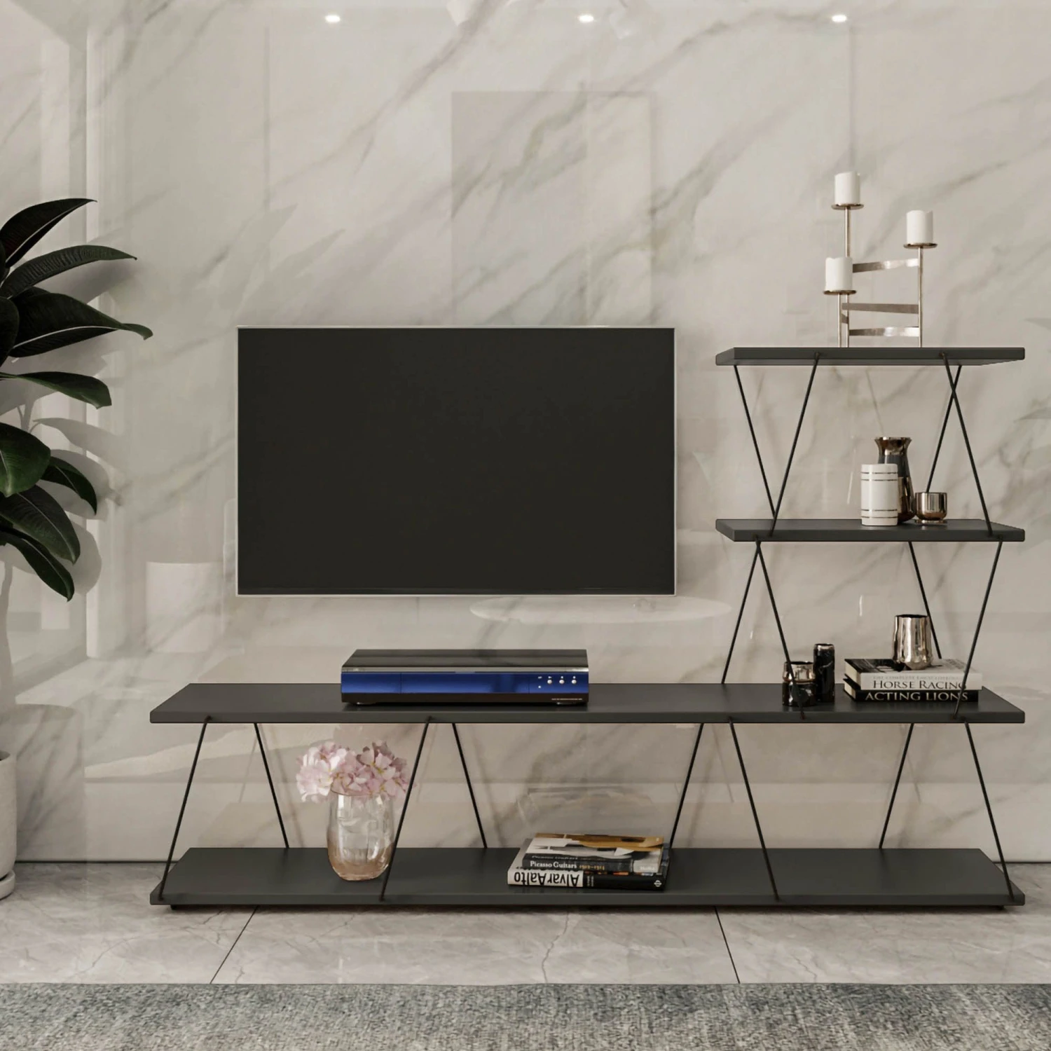 TV Stand heeft een stevige constructie met 18 mm dik gemelamineerd spaanplaat en meet 150x93x30 cm. Het biedt een bovenste plankbreedte van 46 cm en wordt geleverd in een stijlvolle antraciet kleur.