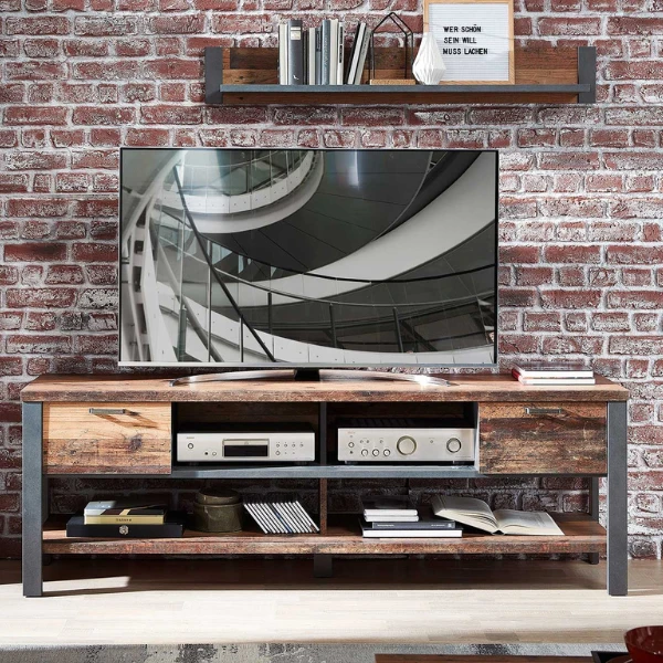 TV-meubel 189x50x58cm uit spaanplaat met een look van oud hout. Met twee lades met metalen handgrepen.