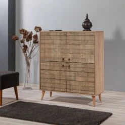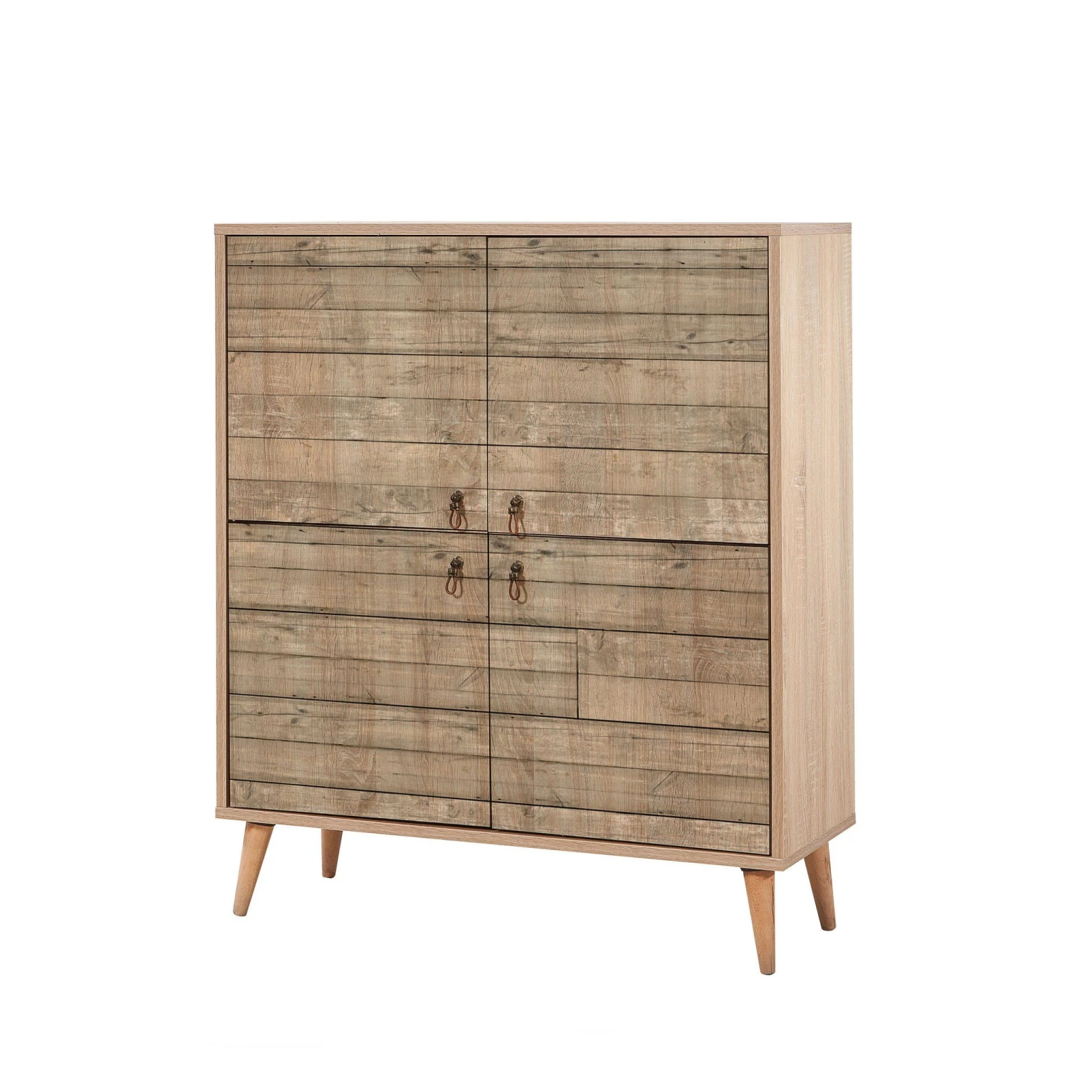 Vella multifunctionele kast is een duurzame en veelzijdige opbergoplossing. Het heeft 100% gemelamineerde spaanplaat, poten van haagbeuk, metalen en touw handgrepen, UV-coating en wordt geleverd in een stijlvolle Sonoma Oak kleur. Het heeft een breedte van 95 cm, hoogte van 111 cm en diepte van 36 cm, met een plankhoogte van 19 cm.