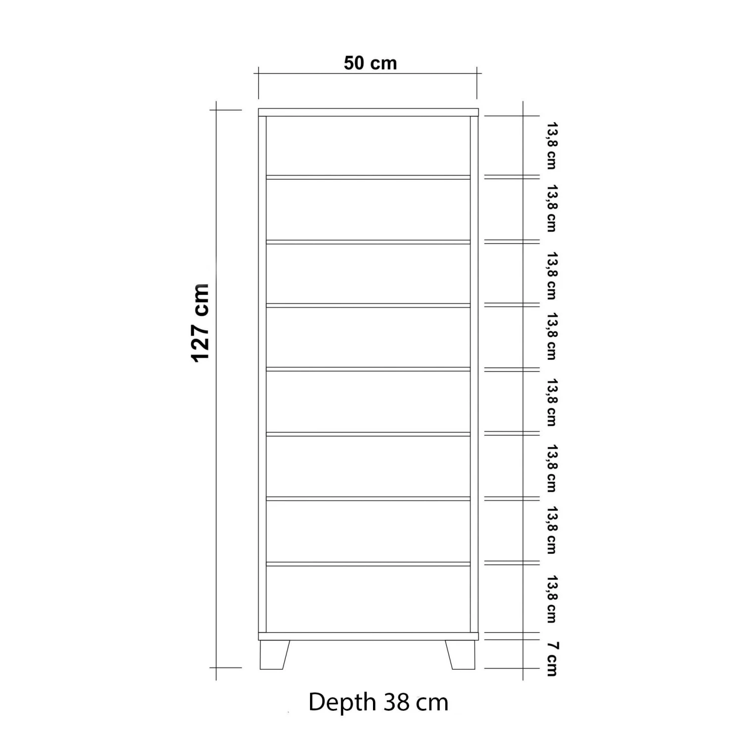 Schoenenkast Vella is een 100% gemelamineerd spaanplaatproduct met kunststof poten, met een breedte van 50 cm, een hoogte van 127 cm en een diepte van 38 cm. Het heeft een plankhoogte van 13 en wordt geleverd in een strakke witte kleur.