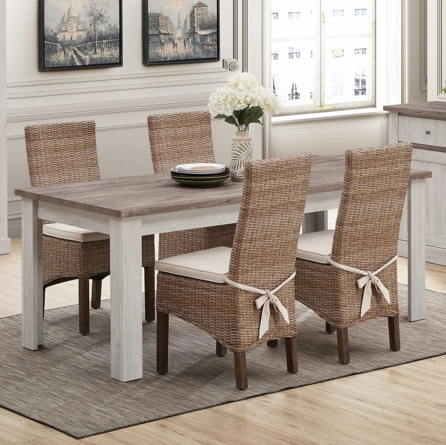 De Elayza meubelen zijn geïnspireerd door de landelijke stijl. Ze zijn gemaakt uit spaanplaat met een decor in witte eik. Deze meubelen beschikken ook over details in grijze eik decor, om enige contrast aan te brengen aan de meubelen.