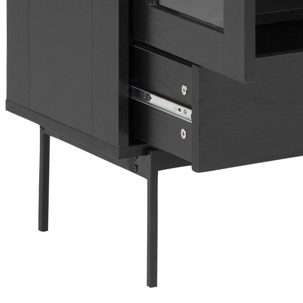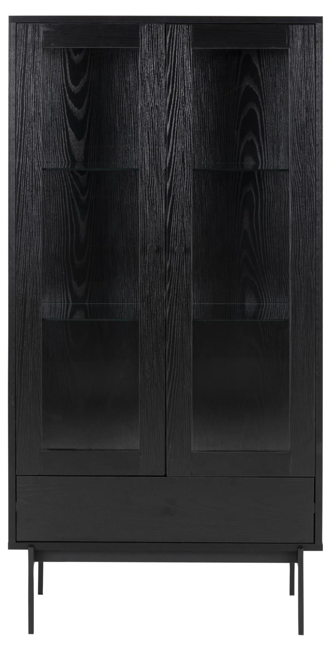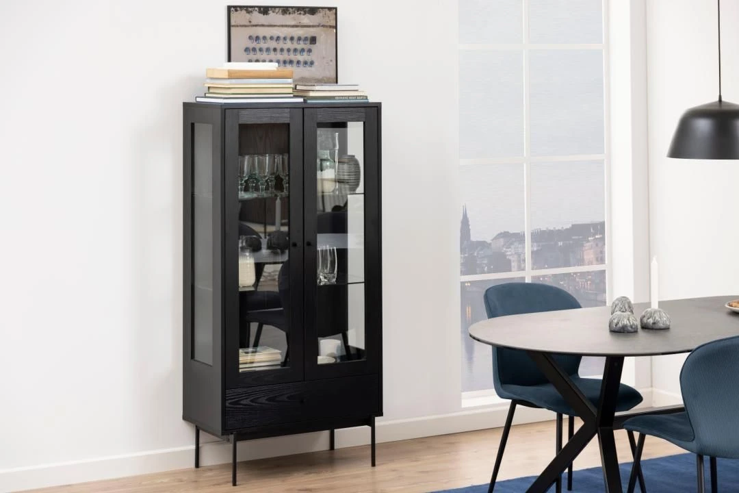 Iedereen heeft wel spulletjes waarvan hij of zij vindt dat het zonde is om ze in een donkere kast te verstoppen. Met vitrinekast Angus krijg je de kans om deze spullen de aandacht te geven die ze verdienen. De kast is namelijk uitgerust met 2 transparante, glazen deuren. In de kast zelf zijn er 2 glazen legplanken voorzien waar je je spullen veilig op kunt zetten. Voor spullen die niet per se zichtbaar moeten zijn, is er aan de onderkant van de kast een lade voorzien. De deuren en de lade zijn gemaakt uit MDF en afgewerkt met een laagje melamine in esdecor.