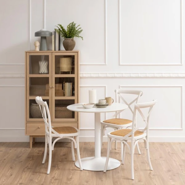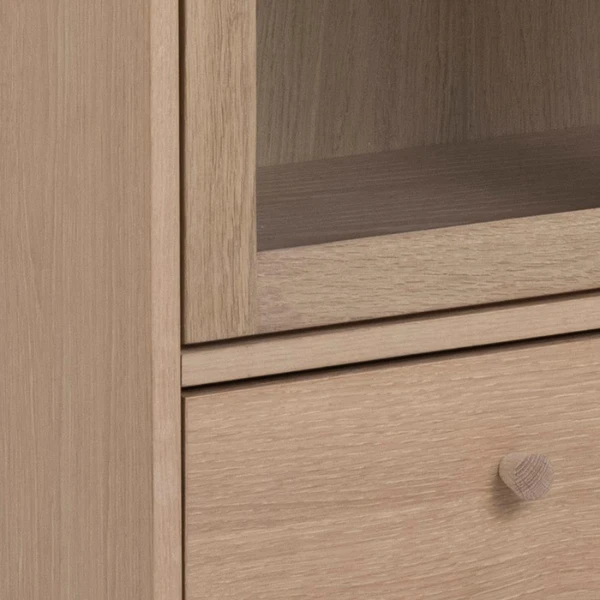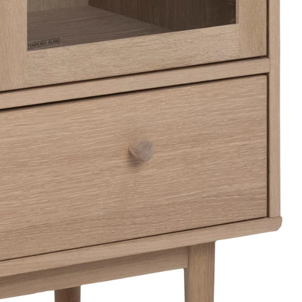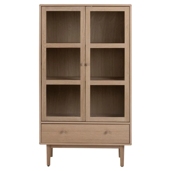 De meubelstukken uit de Aston-collectie passen door hun lichte kleuren en strakke lijnen perfect in een Scandinavisch interieur. Ze zijn gemaakt uit spaanplaat met een decor in witte eik. De lage pootjes (20cm) zijn gemaakt uit eikenhout. Vitrinekast Aston is voorzien van 2 deuren, 2 legplanken en 1 lade. Er is dus voldoende plaats om je spullen in op te bergen. De deuren zijn bovendien voorzien van helder glas. Hierdoor krijg je de kans om bepaalde zaken extra in de kijker zetten.