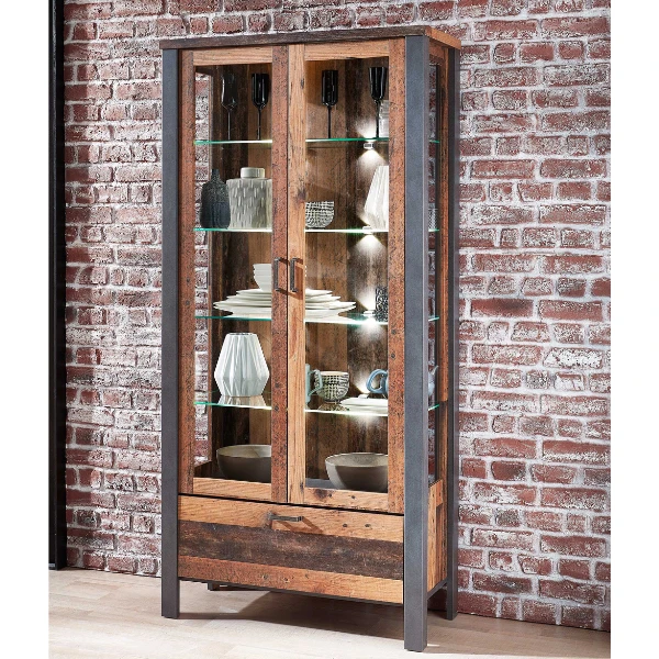 Vitrinekast Carthago 94x40x194cm uit spaanplaat met een look van oud hout. Met twee glazen deuren en één lade. Met metalen handgrepen en LED-verlichting.