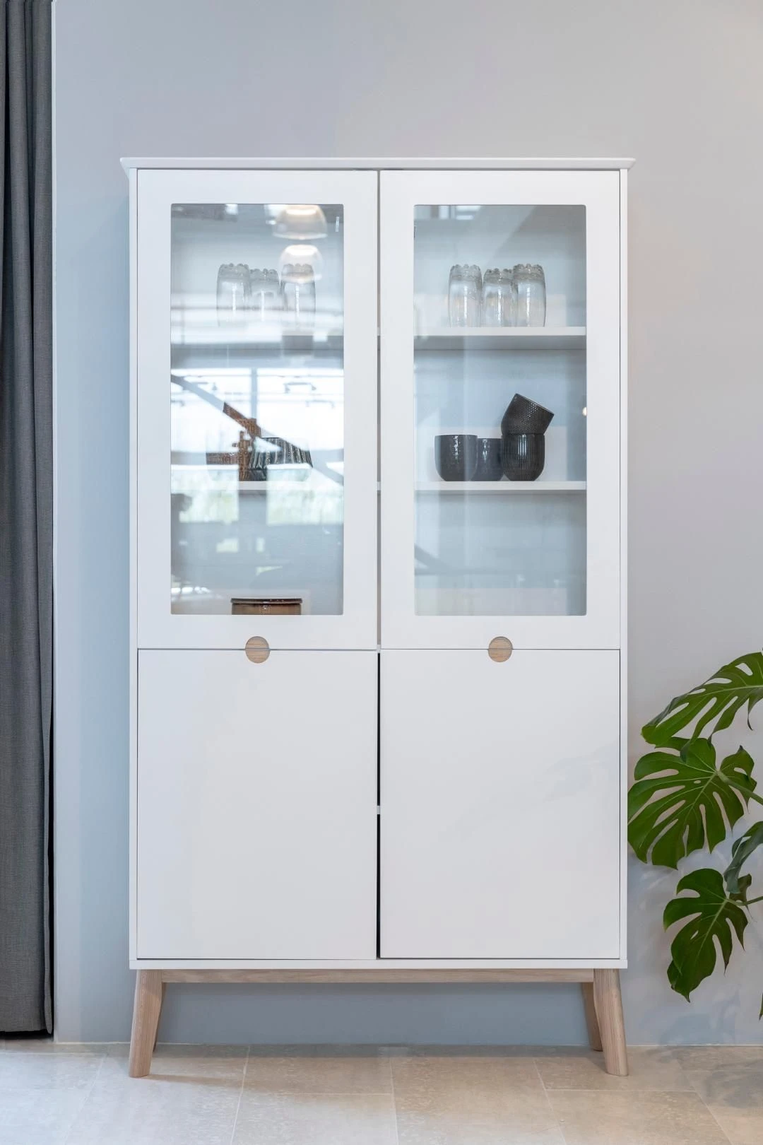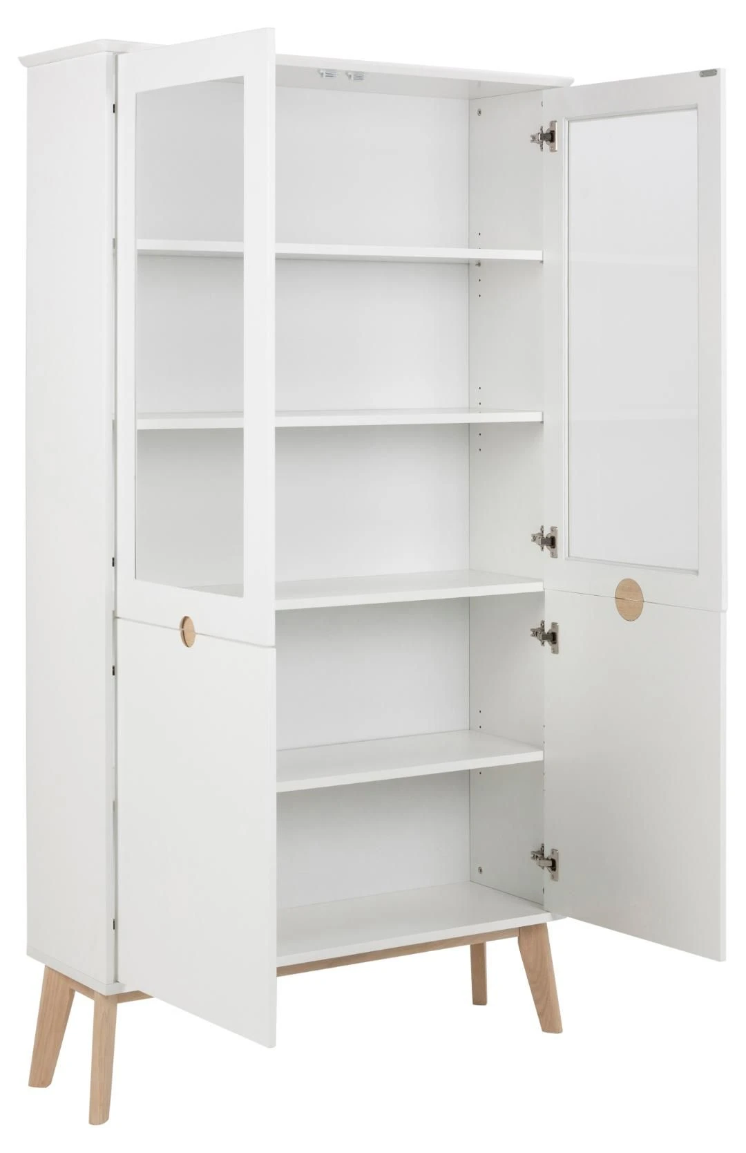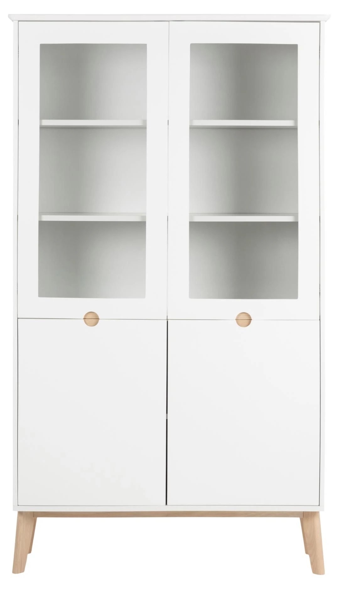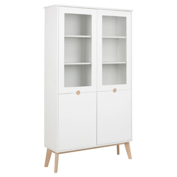 Vitrinekast Cedro met 4 deuren, gemaakt uit poten in wit gepigmenteerde eikenhouten poten en deuren in mat witte MDF.