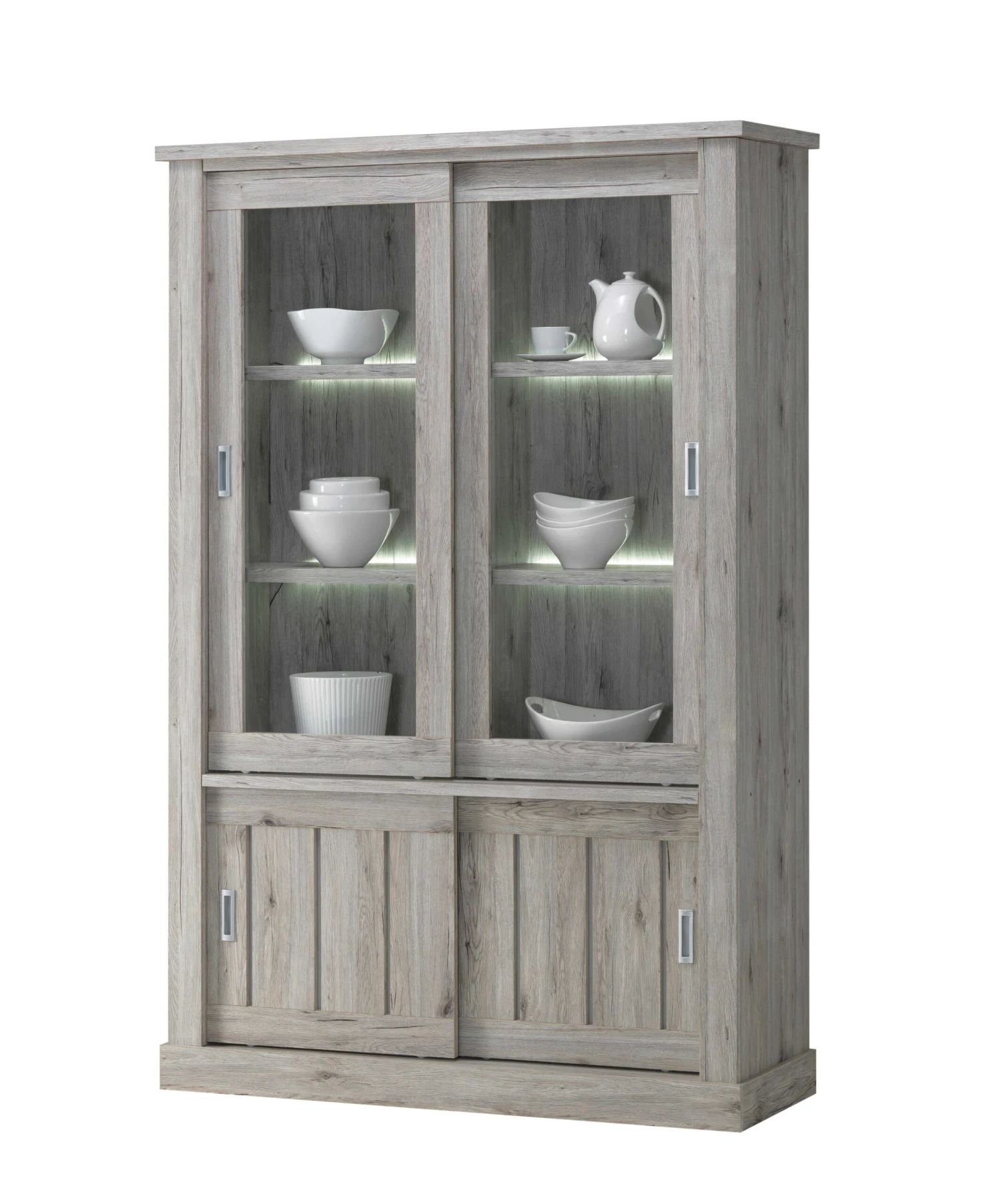 Deze landelijke vitrinekast heeft een prachtig lichtgrijs eikdecor en is vervaardigd uit spaanplaat en MDF. De kast is uitgerust met acht legplanken en vier schuifdeuren waarvan er twee deuren in glas zijn. Plaats jouw dierbaarste bezittingen nog extra in de kijker dankzij de ledverlichting.
