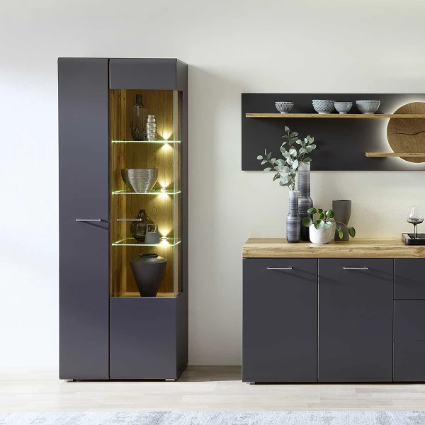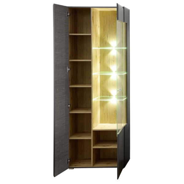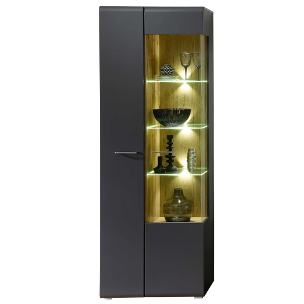Vitrinekast Enso 70x37x201cm uit MDF met afwerking in antraciet. Met twee deuren waarvan één vitrinedeur. Uitgerust met metalen handgrepen en LED-verlichting.