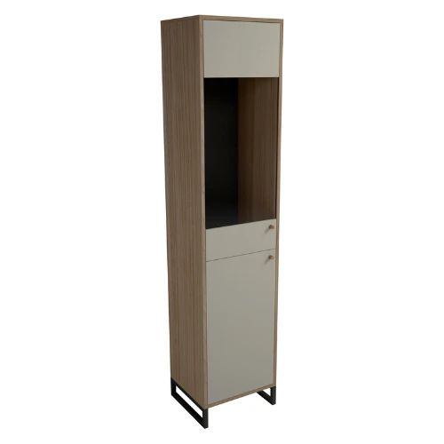 Heb je een verzameling waar je trots op bent of wil je graag veilig je familiefoto’s uitstallen? Deze vitrinekast bestaat uit twee beige deuren, waarvan een groot deel in glas. Ideaal dus om je favoriete spullen tentoon te stellen. De kast is aan zijkanten en bovenkant afgewerkt in walnootdecor en staat op twee zwarte U-vormige poten.