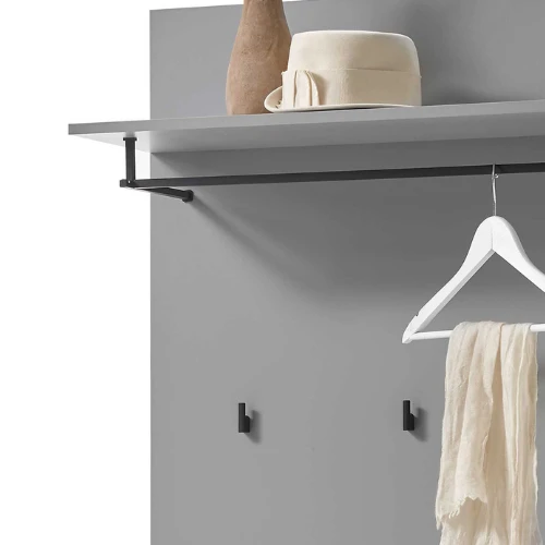 Wandpaneel Seta met 3 haken, hoedenplank en kledingroede. Gemaakt uit spaanplaat in hoogglans grijs.