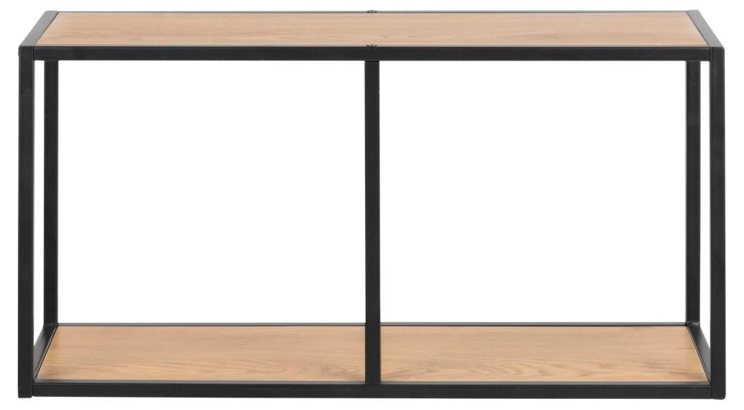 Wandrek Dover, uitgerust met twee legplanken. Gemaakt uit metaal afgewerkt met zwarte poedercoating en wilde eik decor.