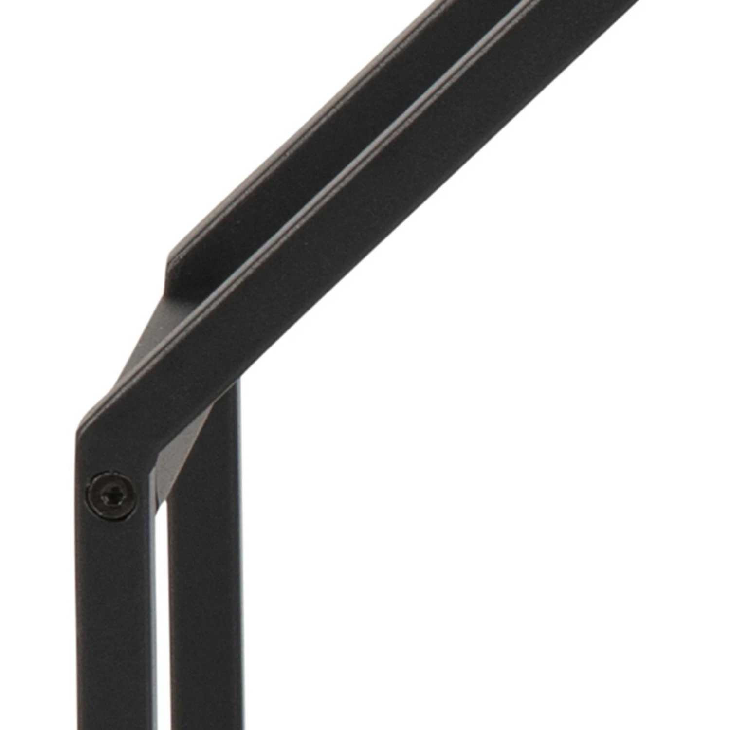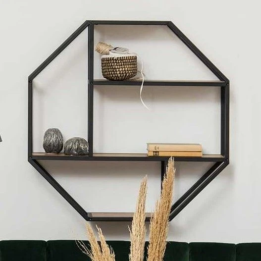 Wandrek Dover met geometrische vormen, gemaakt van matzwart metaal. Legplankjes met eikdecor.