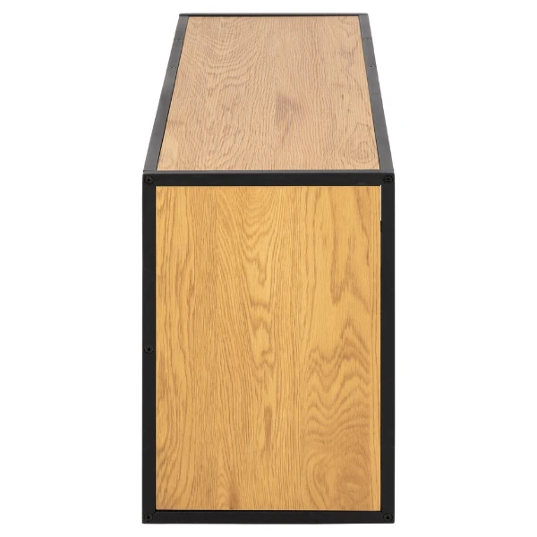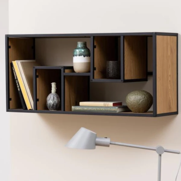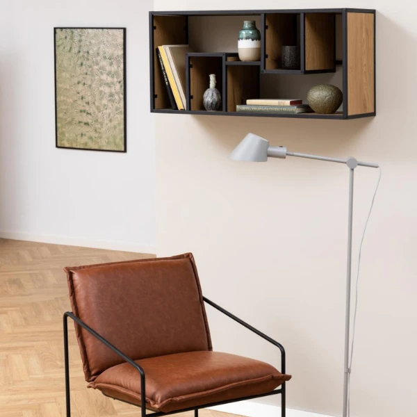 Met de uitgebreide Seaford-collectie tover je in een handomdraai je huis om tot een industrieel paradijs. Zwart en bruin, dé industriële kleuren, zijn volop aanwezig in de meubels uit deze collectie. Dit wandrek heeft bijvoorbeeld een frame uit zwart gepoedercoat metaal en planken in wilde-eikdecor. Omdat een industrieel interieur soms wat somber en ongezellig kan overkomen, is het van belang de juiste accessoires te kiezen. Dit kan zowel een plant, een kaars als een metalen bordje met een grappige tekst zijn. In dit wandrek zijn hiervoor 4 vakken voorzien.