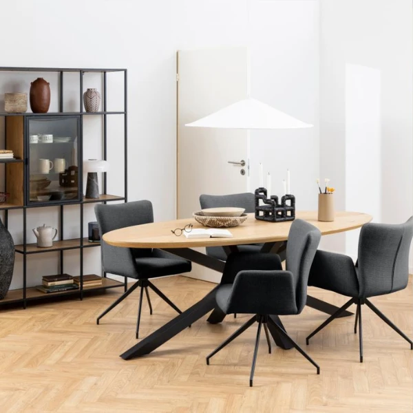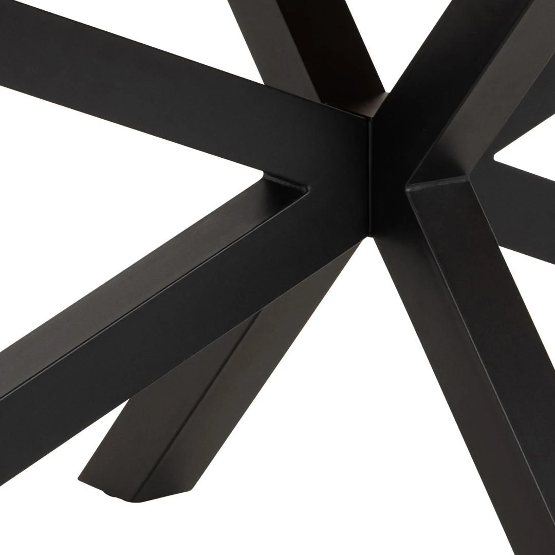 Het kruisvoetstuk van matzwart ruw gepoedercoat staal voegt niet alleen stabiliteit toe aan de tafel, maar vormt ook een opvallend contrast met de warme tinten van het eikenfineer. De ruwe poedercoating zorgt voor een duurzame en resistente afwerking, zodat je eettafel jarenlang in onberispelijke staat blijft.