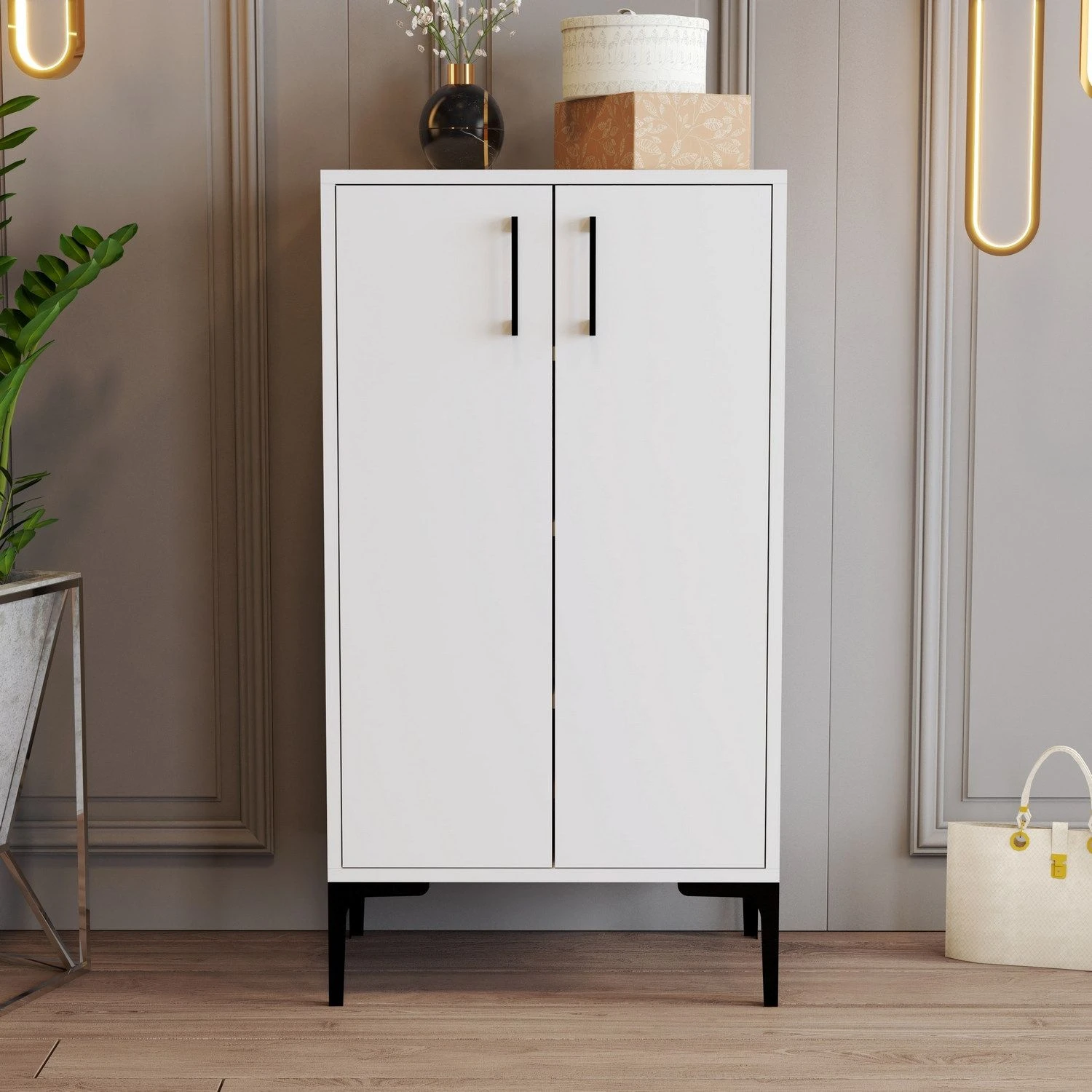 Naast de functionaliteit heeft de Woody Fashion Shoe Cabinet een visueel aantrekkelijk ontwerp dat moeiteloos de esthetiek van je huis zal verbeteren. De slanke witte metalen poten vormen een perfecte aanvulling op de moderne gemelamineerde spaanplaat en zorgen voor een eigentijdse en stijlvolle look. Je kunt nu je schoenencollectie tentoonstellen in een kast die even oogstrelend als praktisch is.