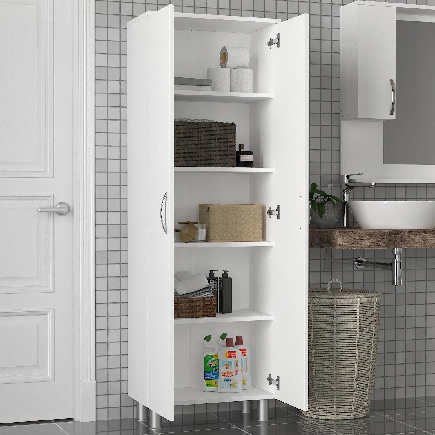 Wooden Art is een 100% gemelamineerd badkamermeubel vervaardigd uit spaanplaathout. Afmetingen: Lengte: 31,50 cm, Breedte: 59,40 cm, Hoogte: 161,50 cm. Het wordt geleverd in een strakke witte kleur.