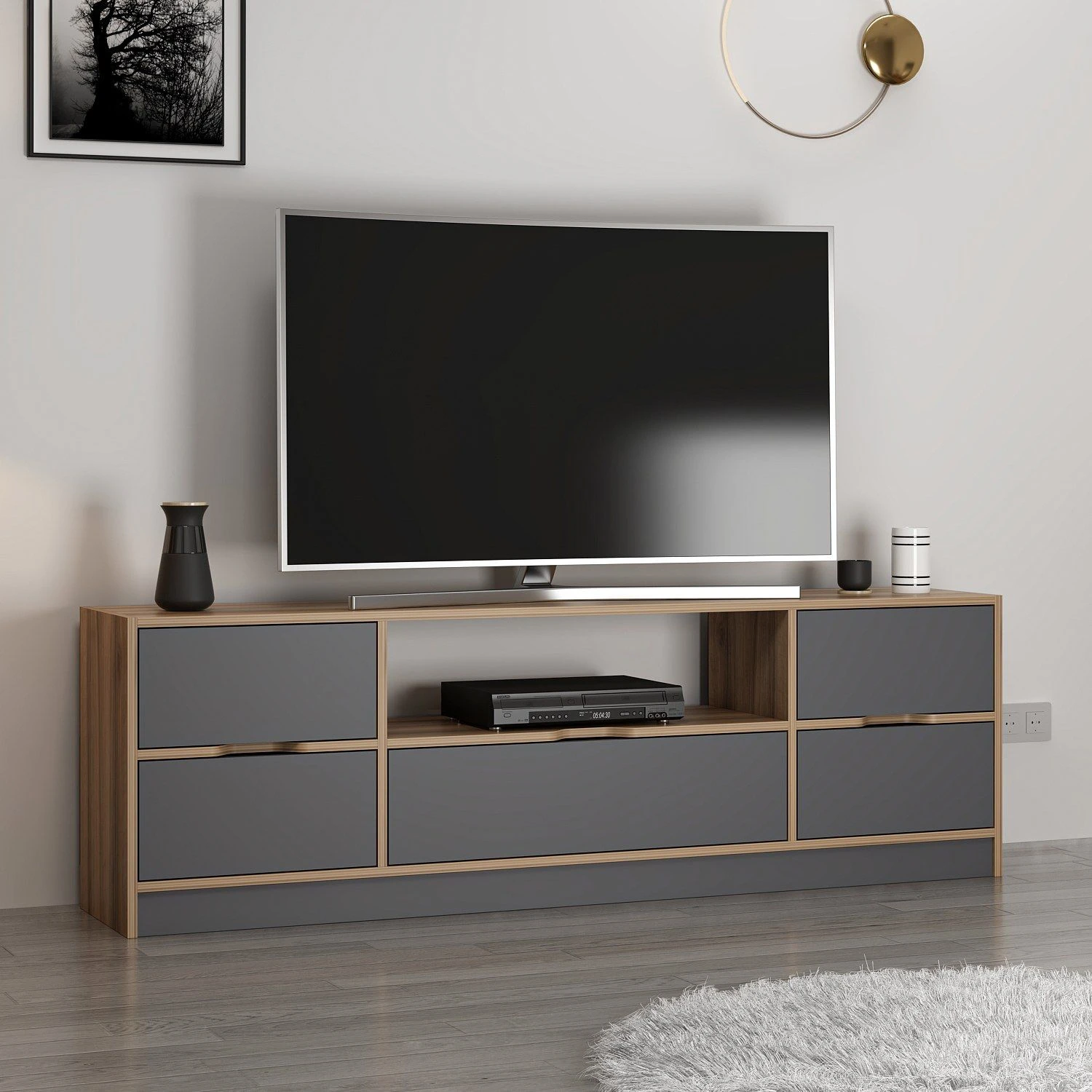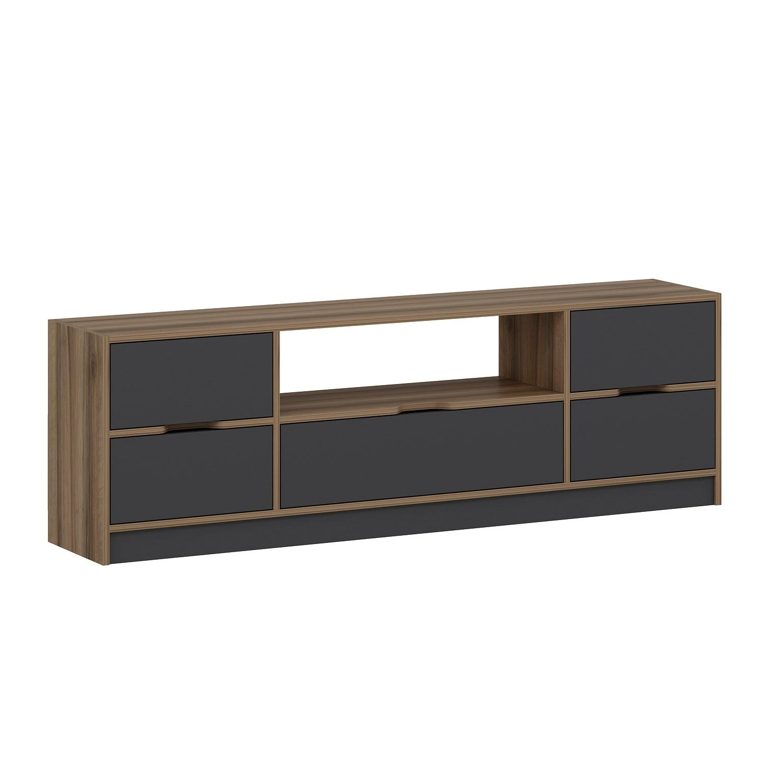 Met een breedte van 180 cm, een hoogte van 57 cm en een diepte van 35 cm biedt dit meubel voldoende ruimte voor je tv, spelconsoles en andere media-apparaten. De walnoot antraciet kleur is verfijnd en veelzijdig en past naadloos in elke interieurstijl.