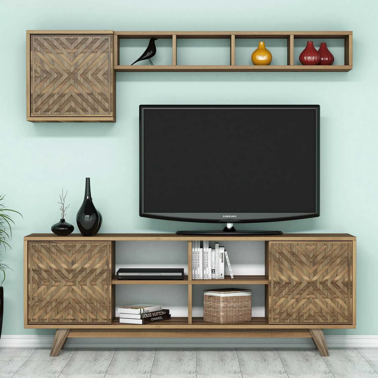 Woody Fashion TV-meubel, gemaakt van 100% gemelamineerd spaanplaat met een dikte van 18mm. De afmeting is 160cm in breedte en 56cm in hoogte, met een elegante walnootkleur.