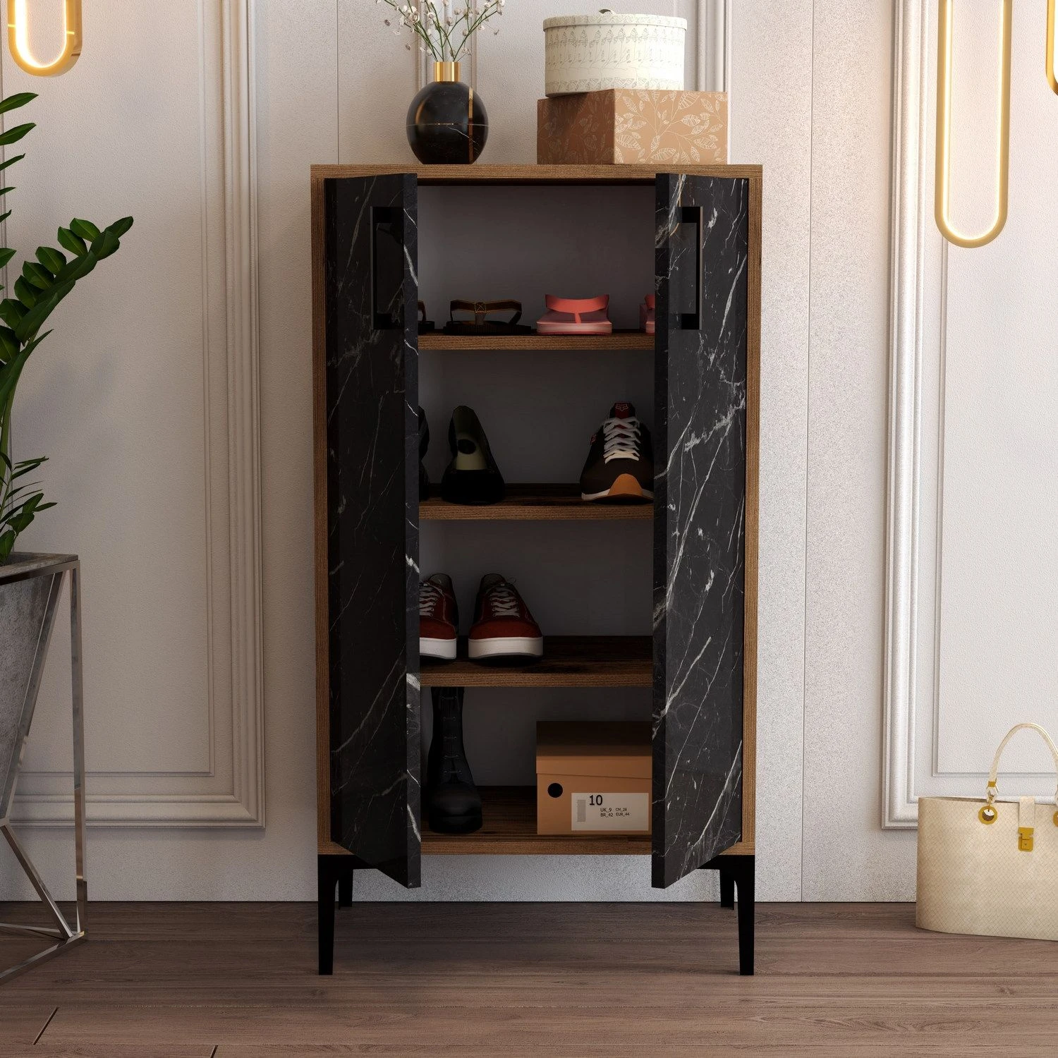 Bovendien voegt de stijlvolle walnootzwarte kleur een vleugje elegantie toe aan elke kamer. Of je nu een hedendaags of traditioneel interieurontwerp hebt, deze schoenenkast past er naadloos in en verbetert de algehele esthetische aantrekkingskracht. Het is een functioneel meubelstuk dat ook dienst doet als decoratief element, waardoor het een veelzijdige toevoeging aan je huis is.
